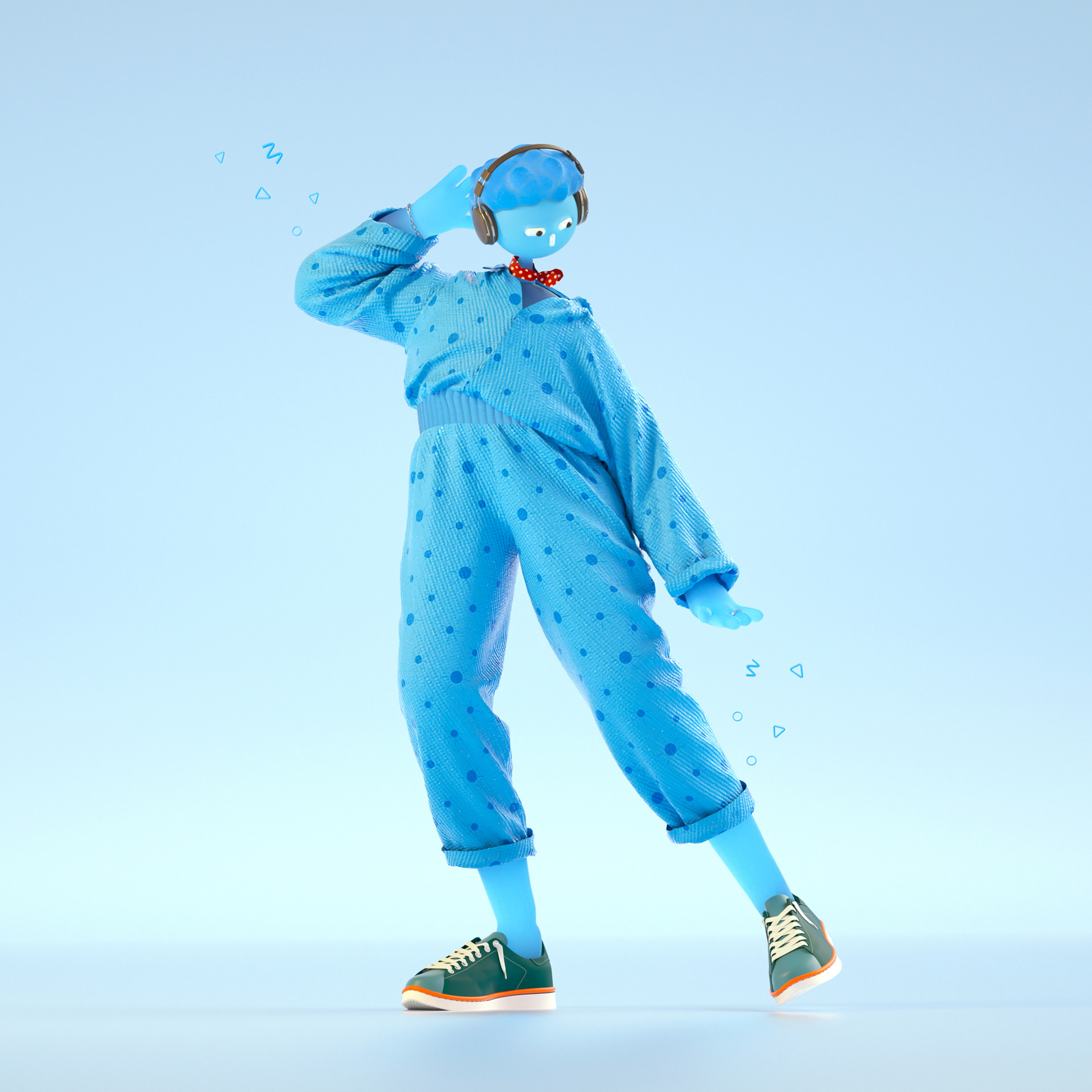 We made many variations in the clothing to get the right level of detail and realism. The subtlety of the pattern animation adds another layer to the final result, with our character floating in the air totally relaxed by their tunes.