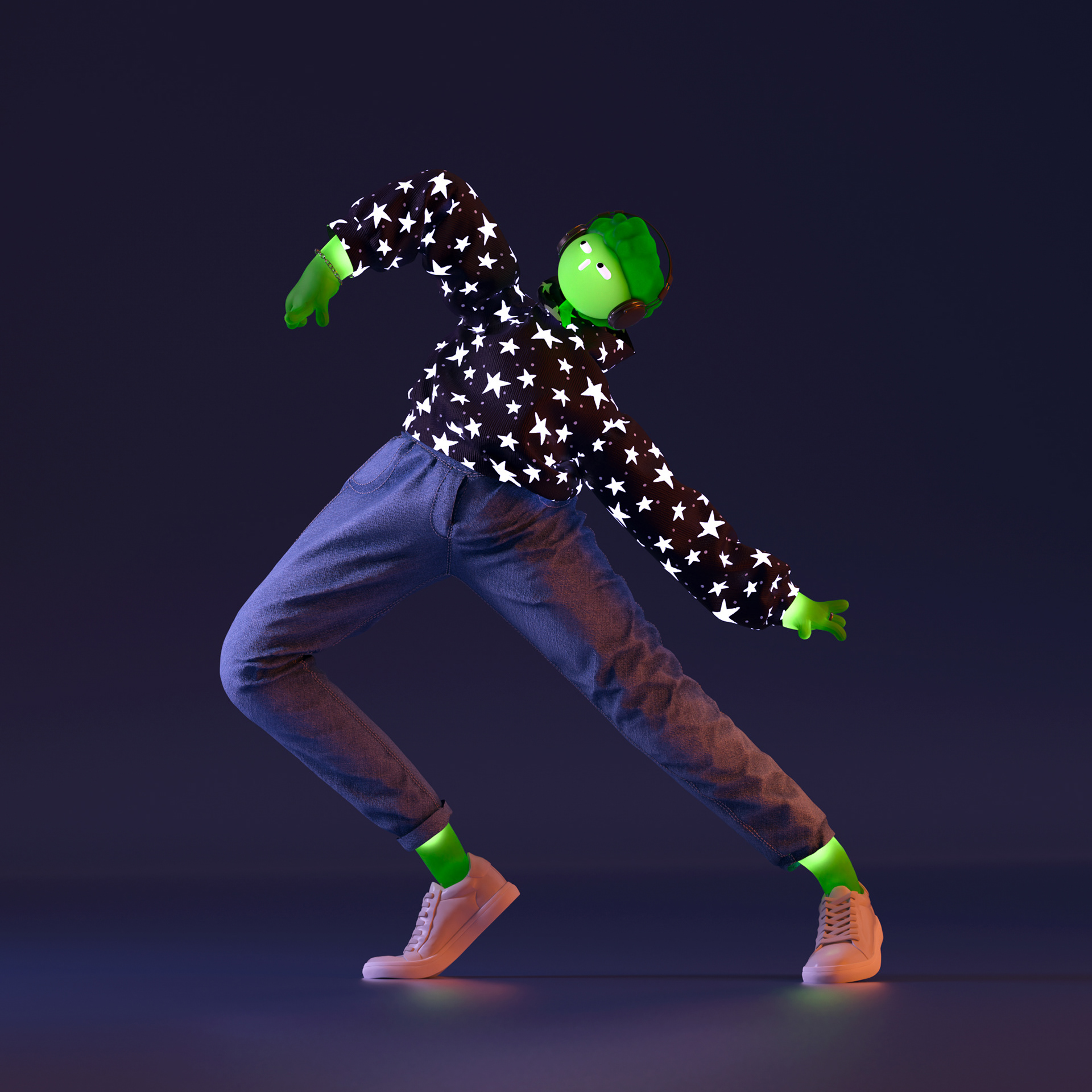 The clothing is uniquely made for each style - pop, rock, country and hip hop - and allows our character to express themself in their crazy dancing.