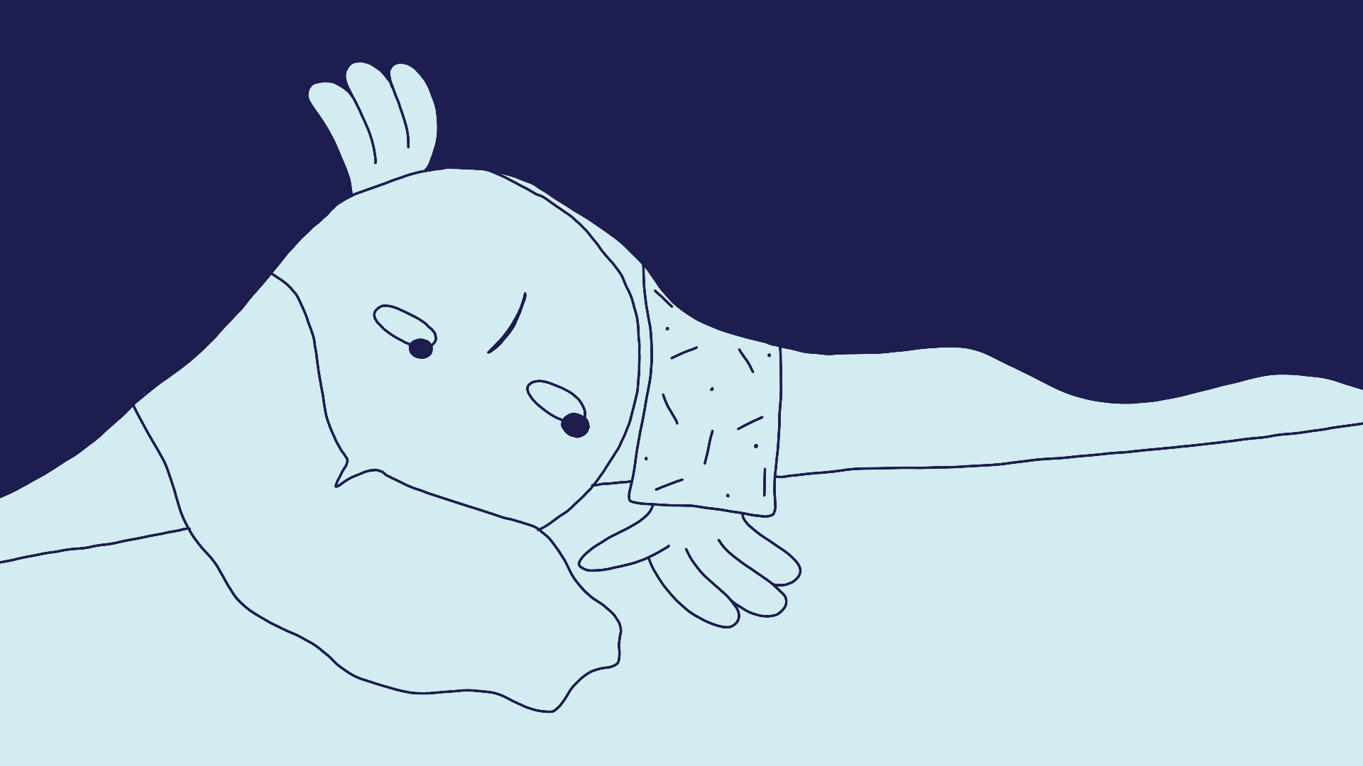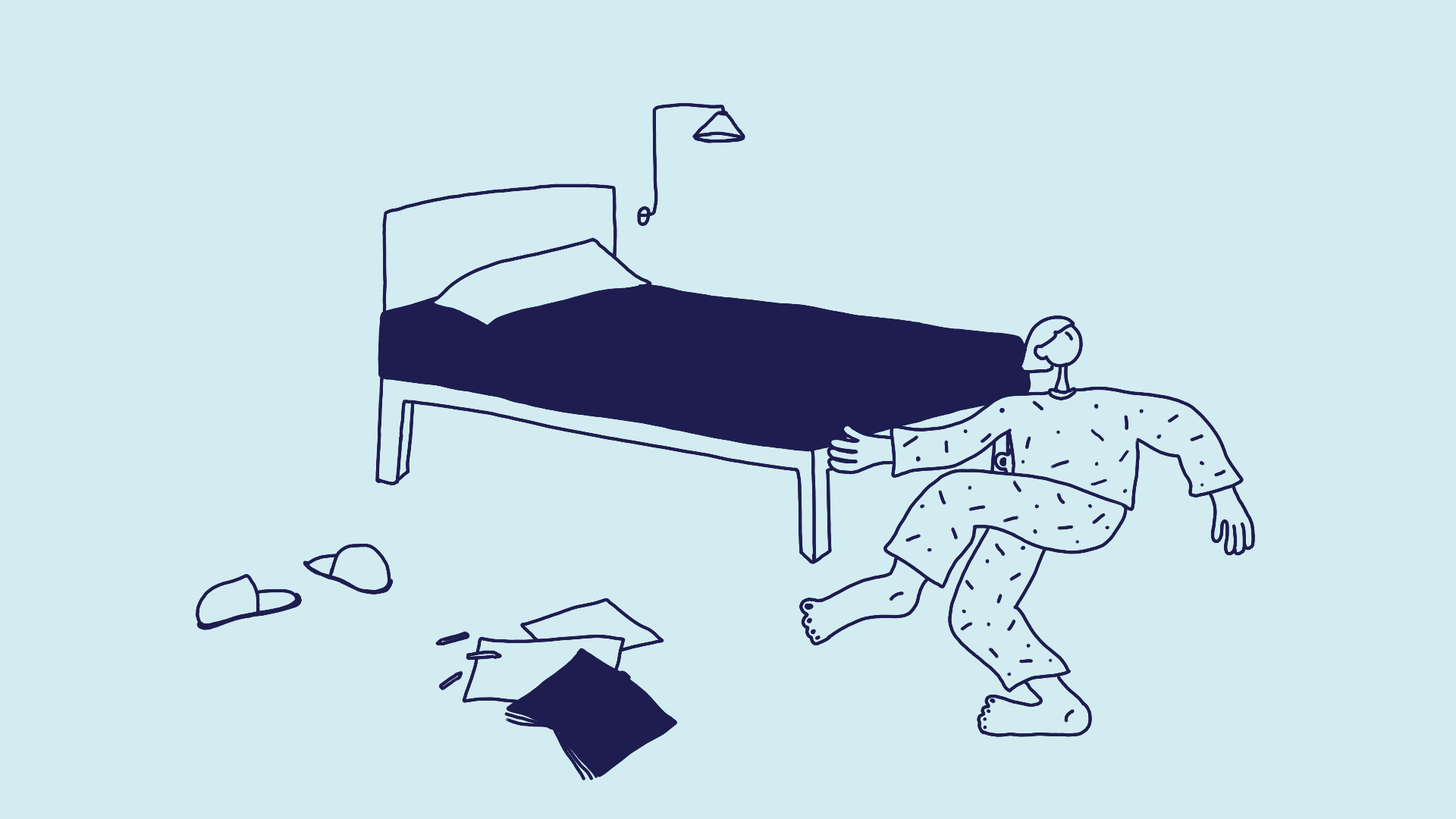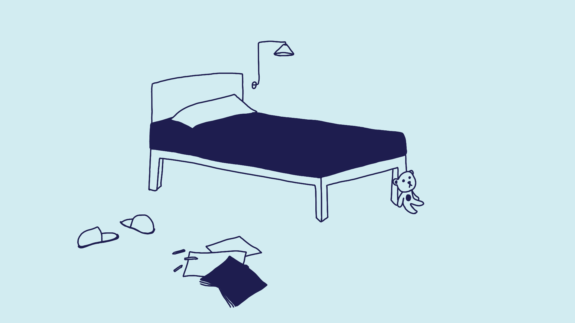 Our character's clothes are handmade. Her pyjamas are mismatching, big and comfortable. They add a cosiness to the scene and remind us of the safety of a home during childhood.