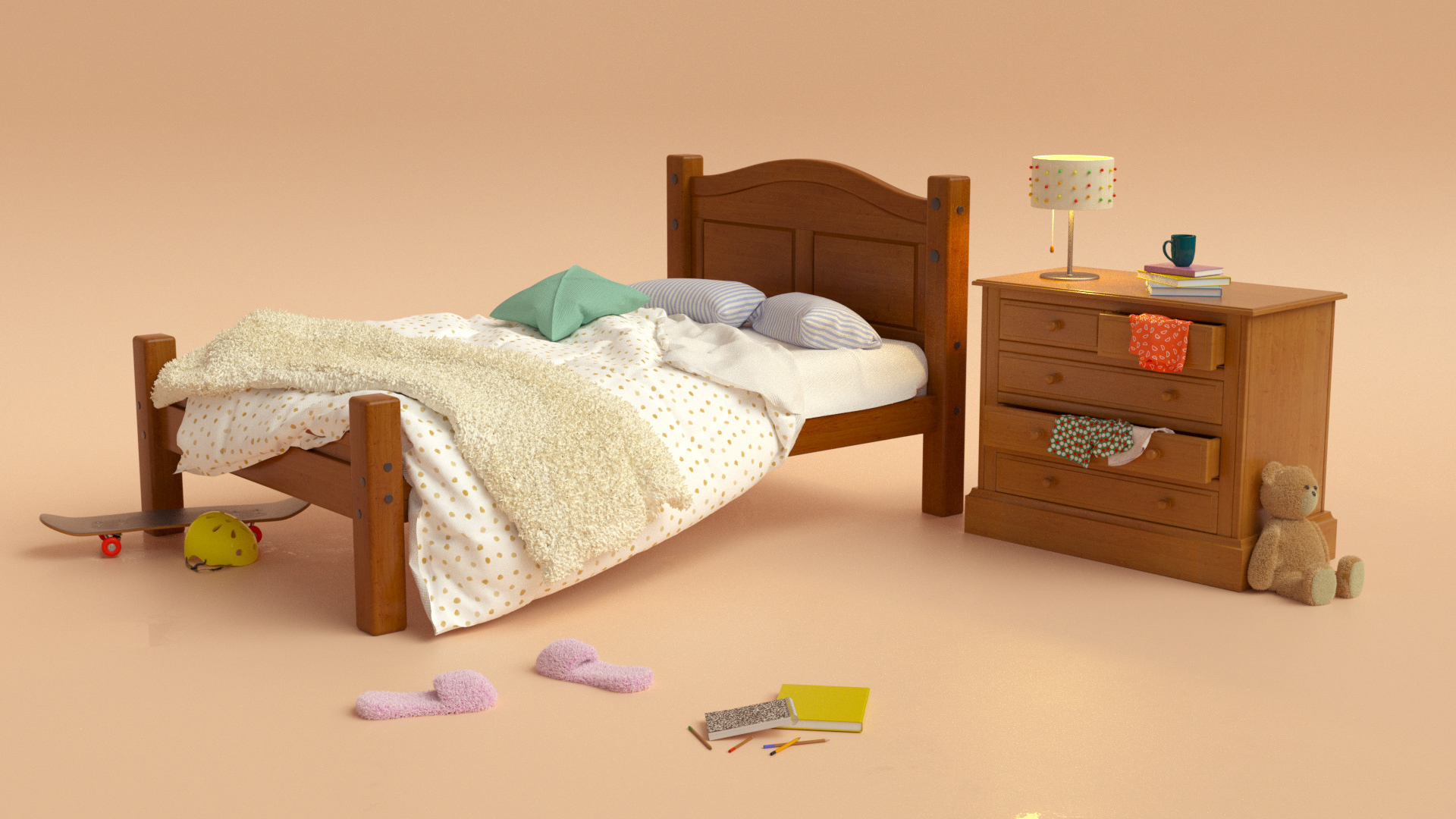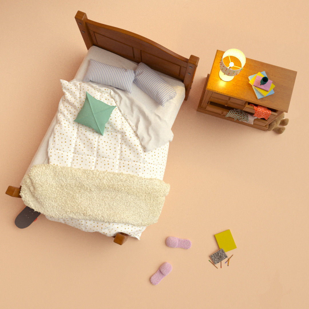 We modeled all the elements from scratch as it allows us to have total control over the look of our project and gives it a clear consistency. Little details like clothes hanging out of the chest of drawers, a skateboard under the bed, or her old teddy bear tucked away but still an important part of her bedroom give humanity to the scene and help us understand our character in a short space of time.